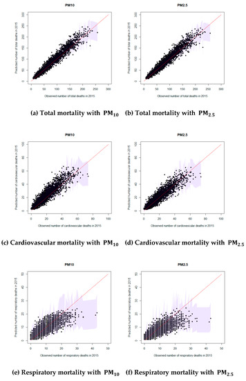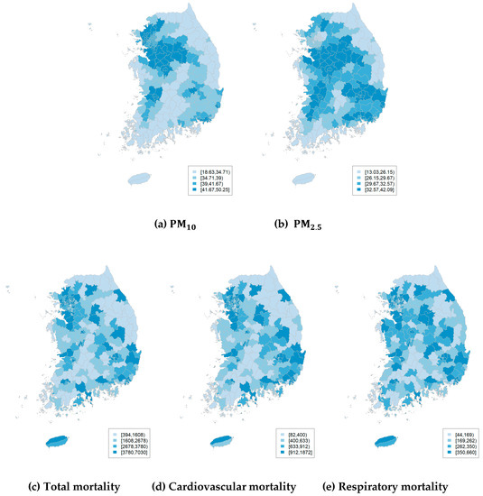 Numerous epidemiological studies have investigated the associations of PM10 and PM2.5 with mortality worldwide [5,6,7,8,9]. One study [5] concluded that PM10 concentration is associated with total, cardiovascular, and respiratory daily mortality in 16 cities in China using a Poisson regression model. Another study [6] showed how air pollutants affect human health in 25 European cities across 12 countries. They determined that a decrease in PM2.5 level could have led to a gain in life expectancy, postponing many deaths in the city. A European study [7] determined that the daily total mortality rose as PM10 and black smoke concentrations increased with a Poisson regression model. The study [8] investigated the short-term positive effects of PM10 and PM2.5 on all-cause, cardiorespiratory, and other-cause mortality in the United States using a Bayesian hierarchical model. Another study in the United States [9] showed that increases in PM10 and PM2.5 concentrations led to increased numbers of post-neonatal infant deaths in 96 cities with populations greater than 250,000. Most of the domestic and foreign studies mentioned above focused on the effects of air pollutants on health outcomes in specific locations. However, to establish national-level air pollution control policy, a study should consider the entire spatial domain of a country.