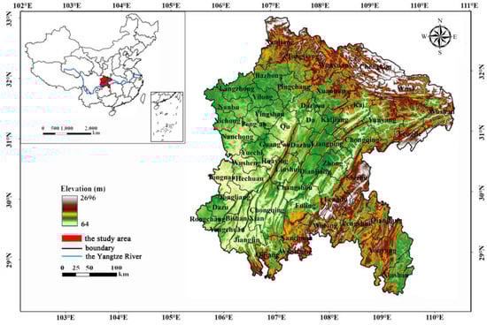 The ESR, situated between E105°11′–110°11′ and N28°10′–32°45′, is located at the end of the upper reaches area of the Yangtze River in the eastern Sichuan Province in China with a total area of 130,143 km2 (Figure 1). The ESR contains five cities that govern 54 administrative counties. The ESR belongs to the mid-subtropical climate type, with an annual average temperature of 20 °C and precipitation of 1000 mm. The elevation ranges from 64 to 2696 m above sea level. The ESR is an important zone of water conservation and ecological shelter in the hilly area of the upper Yangtze River, leading it to a crucial targeted GGP implementation region.