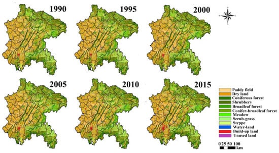 LULC data from the years 1990, 1995, 2000, 2005, 2010 and 2015 at a spatial resolution of 1 km was used as the basic data, which are obtained from the Data Center for Resources and Environmental Sciences, Chinese Academy of Sciences (RESDC). The land cover data were interpreted by visual interpretation using satellite images with an accuracy over 94.3% [29,30]. According to the national criteria announced by the Chinese government in 2007, LULC is divided into 6 primary types, including farmland, forestland, grassland, water land, build-up land and unused land. On this basis, we divided the vegetation coverage type in the study area according to the Vegetation Atlas of China (1:1,000,000). Farmland is divided into paddy field and dry land. Forestland is divided into coniferous forest, broadleaf forest, conifer–broadleaf forest and shrubbery. Grassland is divided into meadow, grassland and irrigation grass (Figure 2).