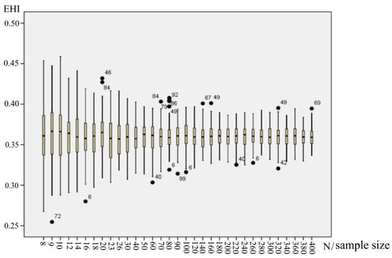 The box-plots of the ecosystem health index (EHI) based on Monte Carlo simulation. (1) Each box-plot represents the dispersion of 100 EHI values obtained in 100 times simulation of a specific sample size (N); (2) the black dots represent the outliers; the number next to the black dots represents the ordinals of 100 times simulation.