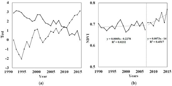 The changes in annual normalized difference vegetation index (NDVI) from 1990 to 2015: (a) Abrupt changes in the annual NDVI from 1990 to 2015 derived from the Mann–Kendall Trend Test Model test statistics, where the year of the intersection is the potential turning point; (b) Variation in the annual NDVI and linear trends for the two periods.