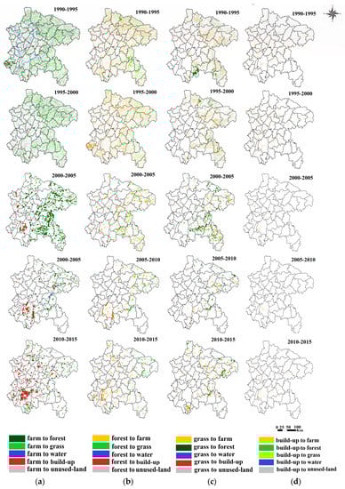 Transfer matrix map of land use: (a) Farmland; (b) Forestland; (c) Grassland; (d) Water land.