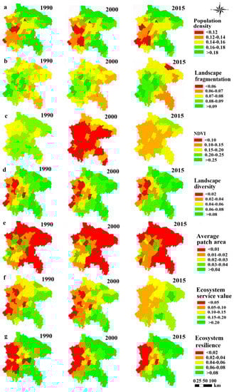 The spatial distribution of different indices at the county level based on standardized data for the years 1990, 2000 and 2015: (a) PD; (b) LFI; (c) NDVI; (d) LDI; (e) APAI; (f) ESV; (g) ER.