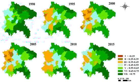 In terms of spatial variation (Figure 8), the following characteristics were identified: (1) counties with a high EHI value were mainly distributed in the eastern part of the ESR, and counties with a low EHI value were mainly gathered in the northern and western parts. (2) From 1990 to 2000, the number of counties with high EHI values decreased, and the number of counties with low values increased. The situation reversed completely in the following period (2000–2015) and the EHI values of most counties continued to be higher than in the former phase. (3) The intensity of ecological recovery carried out by the government was stronger in more devastated areas. This can be confired by the phenomenon that the county with the fastest decline in the EHI in 1990–2000 and the fastest increase in the EHI in 2000–2015 was Fulin. (4) Forest is vital to the ecosystem’s overall condition. The county with the highest EHI value was always Chengkou from 1990 to 2010, but this was replaced by Wulong in 2015. The county with the lowest EHI throughout the study period was Xichong. This implies the ecosystem conditions of Chengkou and Wulong were better than the conditions of Xichong. This is mainly because the proportions of forest areas in Wulong and Chengkou are much higher.