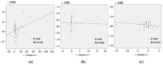 Relationship between the EHI and ecological restoration areas from 2000 to 2015 at the county level, ∆EHI represents changes in the EHI: (a) 2000–2005; (b) 2005–2010; (c) 2010–2015.