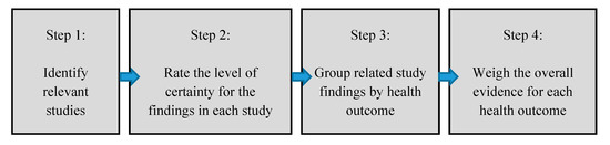 A modified systematic review framework was used to rate the level of certainty (or the certainty in an estimate of effect) for each health outcome (Figure 4). We developed our framework based on established methods of systematic reviews for the medical, public health and environmental health fields. These frameworks incorporate, either explicitly or implicitly, most of Bradford Hill’s criteria for causation such as studies with specificity and biological plausibility and that were temporal and consistent [23]. We consulted these classic criteria to develop a meaningful scope of review (as reflected in the PECO question) and determine criteria for study certainty and weight of evidence [24].