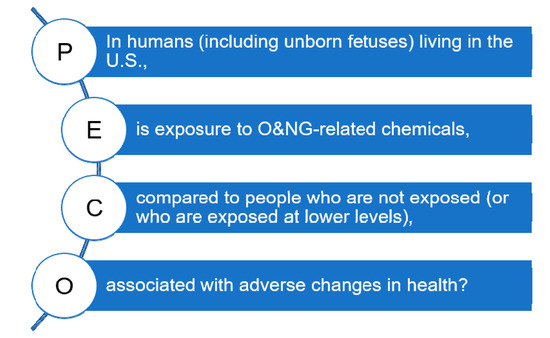 The scope of this literature review is defined by a PECO (populations, exposures, comparators, and outcomes) question [19]: “In humans (including unborn fetuses) living in the U.S., is exposure to chemicals emitted from ONG operations, compared to people who are not exposed (or who are exposed at lower levels), associated with adverse changes in health?” (Figure 2). Unborn fetuses were included as a population of interest to account for the possibility of ONG activities affecting fetal development within the mother’s womb. The term “oil and natural gas operations” (or development) was defined to include all upstream processes involved in the extraction of ONG resources using any combination of vertical drilling, directional/horizontal drilling, and hydraulic fracturing to access energy reserves from conventional and unconventional geologic formations. This review does not include studies evaluating mid- and downstream processes. Since October 2011, the majority of new ONG wells in the U.S. overall have been hydraulically fractured horizontal wells, typically referred to as unconventional wells [2]. Study authors will often use a variety of these terms, and the distinction between conventional and unconventional wells—in source rock, depth, or drilling technique—is muddled in practice [20]. We sought to look across a range of comparators since exposures to ONG-associated chemicals occur along a continuum and it may not always be clear what the pathway of exposure is, how far that pathway reaches, or whether multiple exposure pathways produce synergistic effects on health [5,19]. We then considered whether any and all adverse changes in health occur with these exposures. While it is plausible that ONG may impact health through indirect pathways such as income (e.g., from monetary gains from leasing land or mineral rights), or investment in community infrastructure such as healthcare services [10,21,22], indirect effects were not included in this paper.