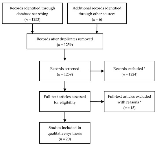 PubMed was the primary research database used to obtain articles. We identified relevant records using the following PubMed search terms: ((“Oil and Gas Industry”[Mesh] OR “Natural Gas”[Mesh]) AND (epidemiolog* or symptom*)) OR ((oil OR natural gas) AND (epidemiolog* OR health OR symptom*) AND (unconventional OR drilling OR shale OR coal OR production OR development) NOT (“Occupational Health”[Mesh] OR “Animal Experimentation”[Mesh]) AND (“2013/01/01”[PDAT]: “2018/10/01”[PDAT])) AND Humans[Mesh]. We verified that no relevant study was published before 2013, and any studies published after our search date of October 1, 2018 were not included in the assessment. In total, 1253 articles were returned by the search and all were screened for eligibility (Figure 3). Review articles, risk assessments, and included studies were also screened for references and identified six additional studies. The majority of articles (98%) did not meet our study inclusion criteria because they were related to the fields of environmental engineering, geology, hydrology or biomedical topics such as plant-based oil extracts/lipids. We kept the search terms broad in an effort to capture the wide variety of terminology that has been used within the interdisciplinary ONG health effects field.