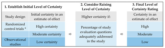 The approach used for developing level of certainty ratings for each study outcome. * No randomized control trials were identified in this review.