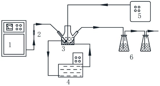 Schematic of experimental apparatus. 1 Ozone generator, 2 Gas-flowmeter, 3 Reactor, 4 Intelligent cryostat, 5 Ultrasonic generator, 6 KI absorption liquid.