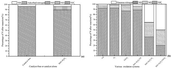 Tests were carried out in the absence and presence of SrO-Al2O3 to evaluate the adsorption capacity of SrO-Al2O3 on ammonia, the results is presented in Figure 2a. As shown in Figure 2a, when aqueous solution pH 8.5, 3.5% of NH4+ was converted to NH3 when no catalyst was present. In the SrO-Al2O3 alone system, the conversion rate of NH4+ was 10.3% and no nitrate and nitrite nitrogen were produced, since the yield of NH3 was 3.5%, indicating that 6.8% of NH4+ was adsorbed by the SrO-Al2O3 catalyst.