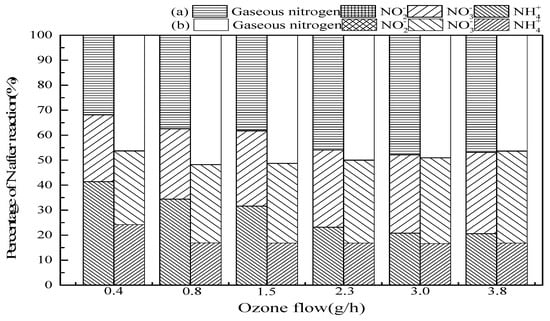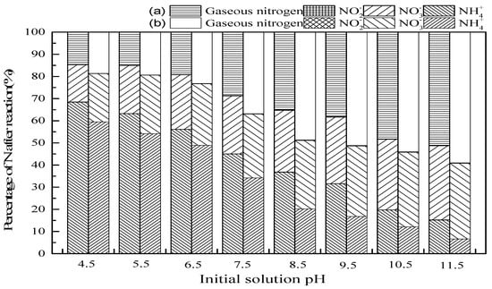 Figure 3 depicts the results showing that the pH of the initial solution is positively correlated with ammonia conversion and gaseous nitrogen selectivity. With the initial pH increasing from 4.5 to 11.5, the percentage of NH4+ decreased, and the production of NO3− and gaseous nitrogen increased in the SrO-Al2O3/O3 and SrO-Al2O3/US/O3 system. On the one hand, the form of ammonia in aqueous solution depends on pH (Equation (9)), NH4+ is predominant at pH lower than pKa, and free ammonia (NH3(aq)) increases at pH higher than pKa [34].