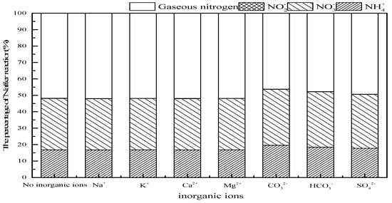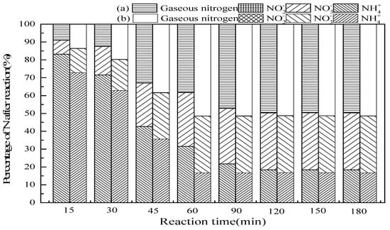 In this study, the products of oxidation of ammonia in aqueous solution are gaseous nitrogen in the gas phase and the residual NH4+, NO2−, and NO3− in the liquid phase. Among them, gaseous nitrogen may include N2, N2O, NO, NO2, NH3 [13,43,44]. The production of NO2− and NO3− was derived from the oxidation of NH4+ and NH3 (aq).