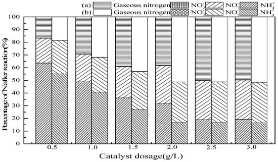 In general, increased catalyst dosages provide more surface-active sites, thus facilitating O3 decomposition into ·OH [35]. As seen in Figure 5, the ammonia conversion and gaseous nitrogen production improved with an increase of SrO-Al2O3 dosage. The dosage of SrO-Al2O3 was 2.5 g/L in the SrO-Al2O3/O3 system, the ammonia conversion and gaseous nitrogen yield reached 81.0% and 50.0%, respectively, while the dosage was 2.0 g/L in the SrO-Al2O3/US/O3 system, the ammonia conversion and gaseous nitrogen yield reached 83.2% and 51.2%, respectively. It is illustrated that the introduction of US cannot only enhance the ammonia conversion but reduce the catalyst dosage.