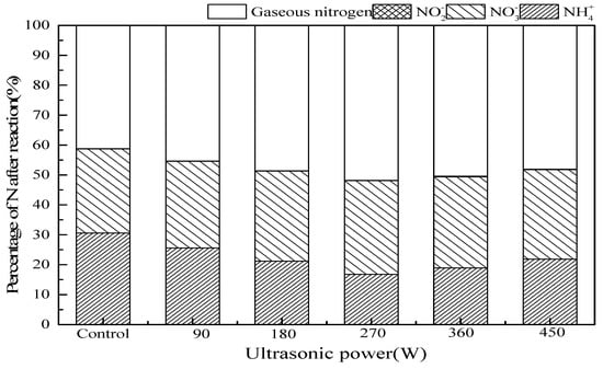 Figure 7 shows the effect of ultrasonic power on ammonia conversion in SrO-Al2O3/US/O3 system. Presence of US improved the ammonia oxidation. With the increase of ultrasonic power from 0 to 450 W, residual NH4+ concentration and gaseous nitrogen yield after the reaction decrease first and then rises. Increasing ultrasonic power from 0 to 270 W can enhance the ultrasonic cavitation, but exceeding 270 W, acoustic shielding appears to reduce the ultrasonic cavitation and the utilization of acoustic energy [31,37]. When the ultrasonic power is 270 W, the ammonia conversion and gaseous nitrogen yield both maximize 83.2% and 51.8%.