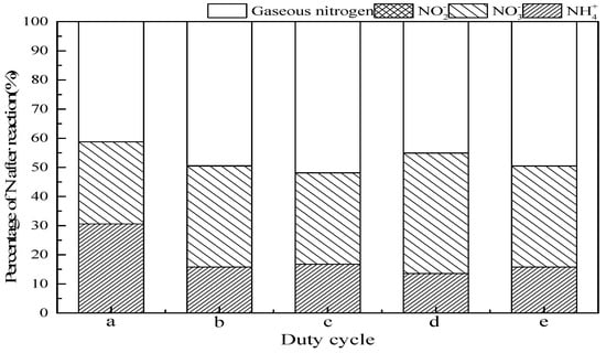 The US can be introduced either continuously or intermittently in the experiments. Since the continuous addition consumes a large amount energy, the intermittent method is adopted. To explore the effect of intermittent ultrasonic operation mode on ammonia conversion in the SrO-Al2O3/US/O3 process, five intermittent operation modes were set up, which were (a) no ultrasound, (b) ultrasonic operation 1 s and interval 1 s (duty cycle 1:2), (c) ultrasonic operation 1 s and interval 2 s (duty cycle 1:3), (d) ultrasonic operation 2 s and interval 1 s (duty cycle 2:3), and (e) ultrasonic operation 2 s and interval 2 s (duty cycle 2:4), as observed in Figure 8. When the duty cycle was 1:3, the ammonia conversion was 83.2%, gaseous nitrogen reached the maximum of 51.8% and the production of NO3− 31.28%. When the duty cycle was 2:3, the ammonia conversion reached a maximum of 86.4%, gaseous nitrogen 41.3% and NO3− production 45.0%.