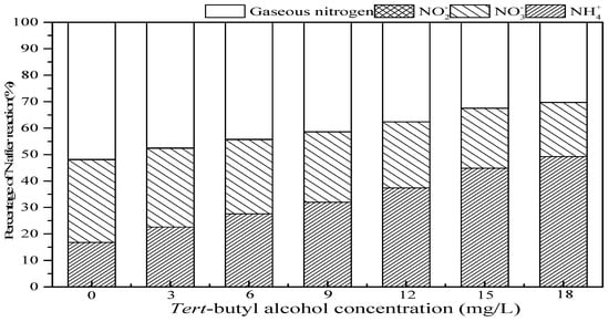 Tert-butanol, a common ·OH scavengers’ agent, is difficult to directly react with O3 (reaction rate constant is K = 3.0 × 10−2 M−1 S−1) but reacts quickly with ·OH (K = 6.0 × 108 M−1 S−1) [38]. In addition, tert-butanol would react with ·OH in bulk solution to form inert substances, which inhibited the chain reaction of ·OH [39,40]. The effect of tert-butanol on ammonia conversion in the SrO-Al2O3/US/O3 system is shown in Figure 9. With tert-butanol concentration increasing from 0 to 18.0 mg/L, the residual NH4+ increased from 16.8% to 49.2%, and the percentage of NO3− and gaseous nitrogen decreased from 31.3% to 20.5%, and 51.8% to 30.2%, respectively. That is to say, the addition of tert-butanol largely inhibits the ammonia oxidation in the SrO-Al2O3/US/O3 system, indicating that the intermediate product (·OH) plays an important role.