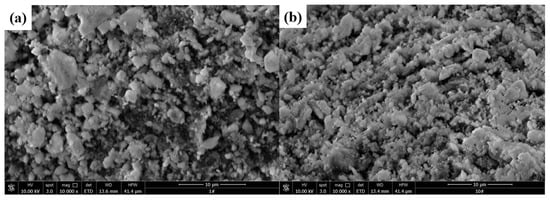 Surface topographies of Al2O3 and SrO-Al2O3 were observed by scanning electron microscopy (JSM-6360LV, Japanese electronics company, Japan) and the results are shown in Figure 12. Figure 12a shows that the surface of Al2O3 is rough and has obvious channels, which will facilitate the loading of SrO. Figure 12b shows that a large amount of irregular small particles is evenly distributed on the surface of SrO-Al2O3 and these small particles are closely joined.