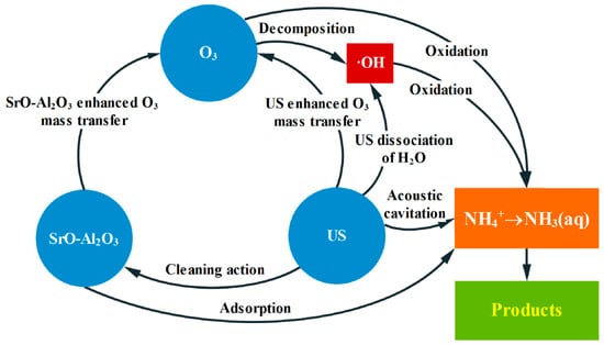 According to the above experimental results, the pathway for ammonia conversion in the SrO-Al2O3/US/O3 system can be inferred, as shown in Figure 13. Under alkaline conditions, ammonia mainly exists in a free state (NH3(aq)). The NH3(aq) oxidation occurs by both O3 and ·OH, whereas NH4+ oxidation is only carried out through ·OH. During ammonia conversion, the SrO-Al2O3 catalyst not only has a certain adsorption effect on NH4+, but accelerates the O3 decomposition to ·OH. US enhances the turbulence degree of liquid phase to promote the ammonia conversion to NH3(aq), while the cavitation effect of US causes H2O to crack to ·OH. In addition, US improves the mass transfer rate of O3, strengthens the O3 decomposition and produces more ·OH. Moreover, the ultrasonic wave cleans the surface of catalyst and slows down the deactivation of the catalyst, thus prolonging the service life of the catalyst. Therefore, the ammonia conversion has been greatly improved due to the synergistic effect of US, SrO-Al2O3 and O3 in the SrO-Al2O3/US/O3 system.
