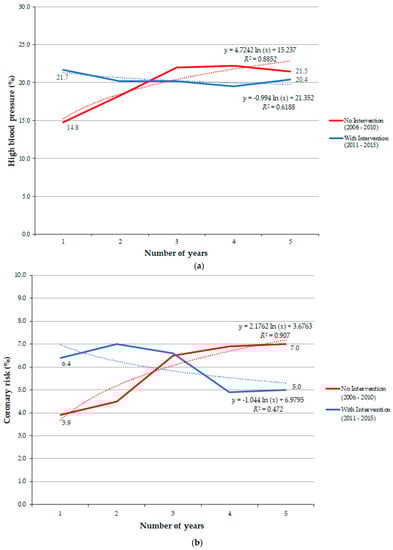 Prediction trend lines corresponding to indicators in which no improvements were observed (a) evolution of the high blood pressure indicator, (b) evolution of the coronary risk indicator.