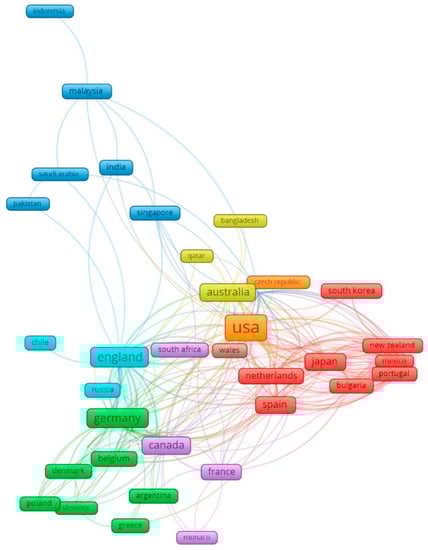 Figure 1 presents the global network among 55 countries collaborating among selected publications. The US ranked first at the number of publication and collaboration networks [36]. Countries such as the United Kingdom (UK), Germany, France, Belgium, and Denmark, which possess the most advanced digital technologies in the Europa [37], had strongly collaborated to promote research in AI for managing depression. The red cluster reveals that Japan and South Korea have also joined this research field by collaborating with highly developed Western AI researchers (Netherlands, Spain, and New Zealand) and proved their potentials to be important researchers in this field [38,39]. In the meanwhile, India and South-East Asian countries, including Singapore, Malaysia, and Indonesia (blue nodes), were highly connected, possibly due to the similar measures of trade and financial flows [40].