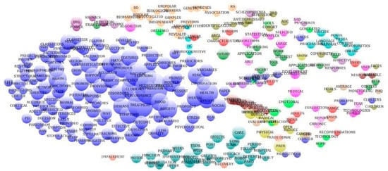 Exploratory factor analysis of abstracts’ contents showed the most frequent research topics (Figure 3). A wide range of research domains, such as symptoms of depression, anxiety, and depression in Parkinson’s disease and other neuropsychiatric disorders, machine learning, and predictive models, diagnostic techniques (neuroimaging, MRI, fMRI) and their accuracy, and treatment outcomes, are specified in cobalt blue cluster. Steel blue nodes, which are located at the bottom of the figure, focus on both short-term and long-term randomized trials targeting the elderly to evaluate the effects of using robots in hospital healthcare services and rehabilitation to reduce depression. Nodes in orange focus on biological analyses through genes and biomarkers, whereas the remaining scatters on the right of the figure mainly refer to technological issues. Statistical characteristics, development of mobile technologies, natural language processing, promising applications, and future works, for instance, are the main research topics.