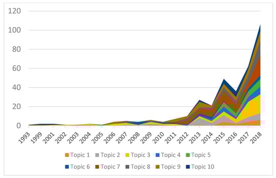 The changes in research productivity over time is illustrated in Figure 4. Significantly more publications were produced throughout the research period, which indicates that the applications of AI in depression attracted more attention, especially during the last few years, as illustrated by a sharp increase from 2016 to 2018. There is no surprise that pattern recognition, neuro-morphometrics, and neuroimaging (topic 7) comprised the greatest percentage of total volume (Table 4), since AI developers and researchers had shown strong interest in this area for nearly a decade. Meanwhile, the EEG and AI-assisted diagnosis (topic 3) had been extensively studied, which indicates the relatively rapid growth of attention on the applications of EEG and AI in assessing depression.