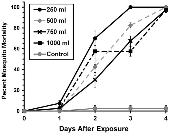 There was a significant difference in times to mortality (F = 261.2, df = 3, p ≤ 0.0001, Figure 1) and in mosquito mortality (F = 96.74, df = 4, p ≤ 0.0001) when mosquitocidal chips were used in different water volumes and a significant interaction between water volume and time (F = 17.05, df = 12, p ≤ 0.0001). Pairwise comparisons among water volumes showed that mosquito larvae exposed to chips in 250 mL of water died at significantly faster rates than mosquito larvae exposed to the chips in all other water volumes (500 mL: p ≤ 0.0028, 750 mL p = 0.0002, 1000 mL p = 0.0174). However, 100% mortality was observed on fourth day for all treatments. The larvae in 250 mL treatment reached 100% mortality 24 h prior to larvae exposed to at all other volumes.