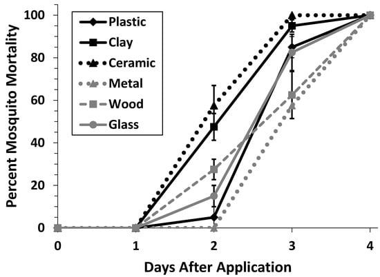 Percent mortality of Ae. aegypti when exposed to mosquitocidal chips containing 0.01% Pyriproxyfen in containers of different materials. No mortality was observed in untreated controls (not shown). Error bars represent ± SEM.