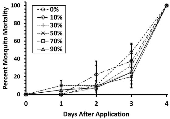 Percent mortality of Ae. aegypti when exposed to mosquitocidal chips containing 0.01% Pyriproxyfen in containers with water at different concentrations of organic matter. No mortality was observed in untreated controls (not shown). Error bars represent ± SEM.