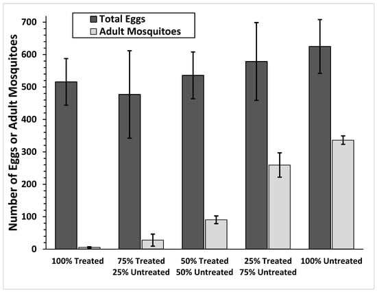 Total number of Ae. aegypti eggs laid and adults emerged using five different treatments: (a) 100% Treated—All 4 mosquito breeding cups treated with mosquitocidal chips containing 0.01% pyriproxyfen; (b) 75% Treated 25% Untreated—3 of 4 cups treated with mosquitocidal chips; (c) 50% Treated 50% Untreated—2 of 4 cups treated with mosquitocidal chips, (d) 25% Treated 75% Untreated—1 of 4 cups treated with mosquitocidal chips, and (e) 100% Untreated - none of 4 mosquito breeding cups treated with mosquitocidal chip. Error bars represent ± SEM.