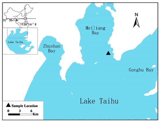 Lake Taihu, located in the Yangtze River Delta, is the second largest shallow freshwater lake in China. It has a water surface area of 2427.8 km2 and an average water depth of 1.9 m [24]. It is an important resource for drinking water, shipping, freshwater aquaculture, and farming. Recent toxic cyanobacterial blooms caused by excessive human nutrient loads have focused attention on controlling blooms and restoring the lake to acceptable water quality and nutrient conditions [1,25,26]. Water samples for simulated experiments were collected in Meiliang Bay (120°12′49.67″ E, 31°29′09.99″ N), which is located in the northern part of Lake Taihu (Figure 1). Meiliang Bay has been eutrophicated and suffered from harmful algal blooms during the past decades, where Microcystis aeruginosa (M. aeruginosa) is one of the dominant species [27]. The excessive growth of toxic M. aeruginosa greatly deteriorated the water quality, damaged the natural functions of lake system, and even threatened the drinking water resources.