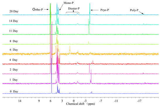 31P NMR spectra of PPOM (Water samples were taken and measured on days 0, 1, 2, 4, 5, 6, 7, 8, 11, 14, and 20).