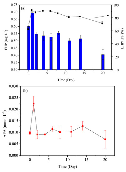 The variation of EHP concentration in PPOM is shown in Figure 3a. The EHP concentration in the particles at the beginning of the experiment ranged from 0.401 to 0.584 mg·L−1 in the first two days, and it began to decrease slowly on the 3rd day. According to the EHP: TPP ratio in PPOM, the ratio of particulate enzymatic P to total particulate P is 60%. This ratio rises rapidly to about 90% after one day, and remains at 90% for the next eight days. From the 9th day, the particulate EHP continues to decline, and the rate of decline is much higher than that of TPP. As shown in Figure 3b, the APA trend is similar to that of EHP. The overall trend is as follows: rapid rise, rapid decline, and finally a stable period. APA concentration reached a high peak on the first day (0.022 mmol·L−1), then rapidly decreased to 0.009 mmol·L−1 on the 2nd day followed by no significant change from day 3 to 14. Finally, APA showed a slowly decreasing trend.