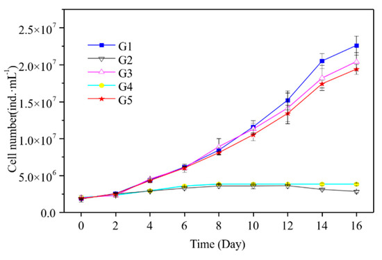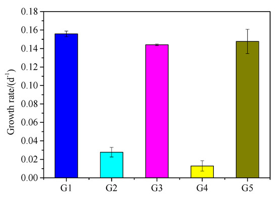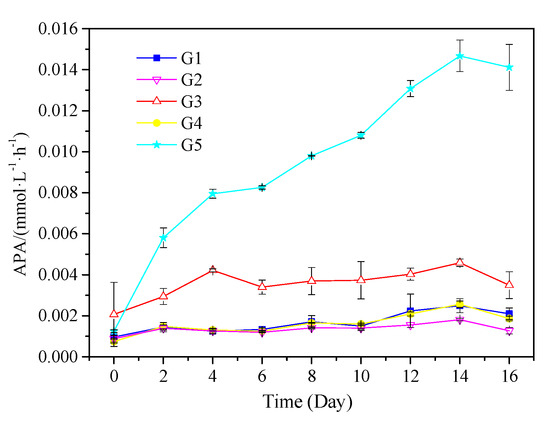 M. aeruginosa cell density and growth rate changes are shown in Figure 4 and Figure 5. M. aeruginosa growth rate could be promoted by five kinds of media, but the growth rate was significantly different. G1 had the highest density of M. aeruginosa (2.3 × 107 cells·mL−1), followed by G3 and G5 with 2.0 × 107 and 1.9 × 107 cells·mL−1, respectively. M. aeruginosa density increased very slowly in G2 and G4, and was one order of magnitude lower than in G1, G3, and G5. As shown in Figure 5, M. aeruginosa growth rate in in G5 was similar to that in G1 and G3, which was significantly higher than that in G2 and G4. As shown in Figure 6, the APA continued to rise after the start of the experiment in G5, and was significantly higher than that in the other groups, reaching a peak of 0.015 mmol·L−1·h−1 at the 14th day of the experiment. In G1, G2, and G4, APA always remained at a low level of about 0.002 mmol·L−1·h−1. In G3, APA maintained a fluctuation between 0.003 and 0.004 mmol·L−1·h−1 after the 4th day.