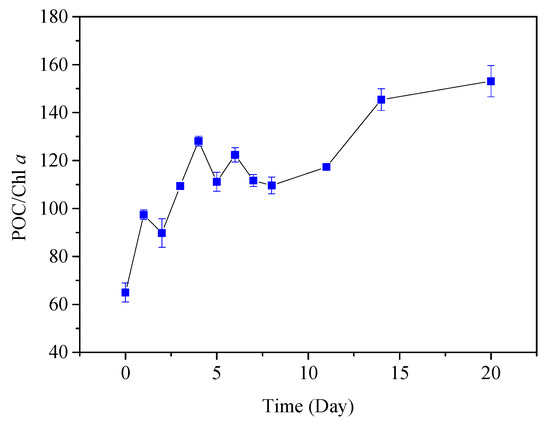 Studies have used the POC: Chl a value to characterize the proportion of fresh cyanobacteria and cyanobacteria degradation residues in particulate matter [41,42]. It is generally believed that when the POC: Chl a value is less than 200, it indicates that fresh living cyanobacteria are dominant in the particles. Contrastingly, if the POC: Chl a value is greater than 200, dead cyanobacteria and their degraded residues are dominant in POM [43]. In this study, POC: Chl a averaged 70 at the beginning of the experiment and then increased, but did not exceed 200 during the experiment (Figure 7). During the process of bloom and phytoplankton proliferation, PPOM (with low POC: Chl a value) derived from algal growth was continuously produced.