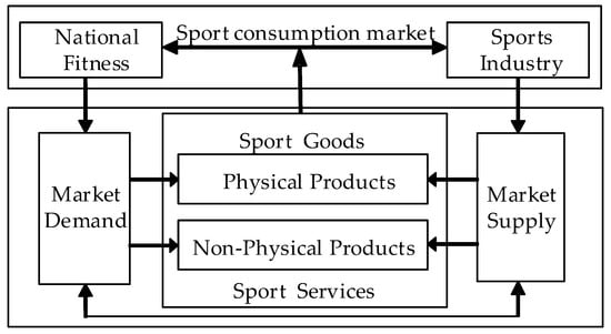 The development of the sports industry cannot be separated from sport consumption [41]. Market products provided by the Chinese sports industry are supplied to the residents and the government in the form of final consumption products. The sports industry is a typical consumption industry at present. According to the changing trend of social production structure, the industrial structure (product structure) is determined by the consumption structure [42]. Therefore, in accordance with the national fitness consumption structure, the market products provided by the sports industry are divided into physical and non-physical types. The physical products are all kinds of sports facilities, sports clothing, shoes and hats, training equipment and other sport goods which are provided to society in the form of manufacture. Non-physical products are non-physical forms of living labor to provide various sport services to society to meet people’s physical fitness, entertainment and spiritual need of the product. In the fitness consumption market, the two symbiotic units of national fitness and the sports industry form a supply-demand relationship, as shown in Figure 1.