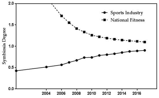 To further observe the symbiosis trend of national fitness and the sports industry, the time series diagram of symbiosis degree of national fitness and the sports industry can be made according to the results of Table 2 data analysis (Figure 3). Figure 3 demonstrates that the symbiosis degree of national fitness and the sports industry gradually approaches the value of 1 from 2000 to 2017. When both values are 1, the symbiosis coefficient θ i = θ j = 1 2 , and the symbiosis coefficient between the two will reach symmetrical symbiosis. Therefore, the symbiosis system of national fitness and the sports industry has the trend of positive symmetry and reciprocal symbiosis.