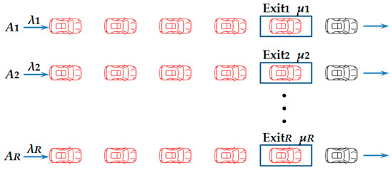Assume that there are A vehicles in the parking lot, which has R exits. When the evacuation begins, vehicles will randomly choose to queue at any exit waiting to leave, which generates R queues in the parking lot, shown in Figure 2. We define the queue at the exit r as queuing system r, r = 1,2,⋯,R.