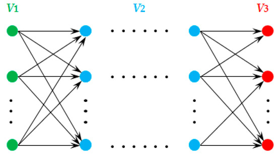 The second period of the evacuation process for a parking lot with multiple exits can be described as a multi-origin and multi-destination evacuation problem [33]. We represent a multi-origin and multi-destination evacuation network in Figure 3, where vehicles are evacuated from origins V1 through mid-points V2 to destinations V3.
