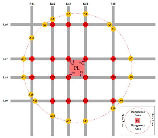 A city parking lot in Xi’an, a city of western China, was employed to test the approach framework proposed in this research. The layout of the road network is plotted in Figure 4. We assumed that a maintenance action would be conducted to the parking lot at 2:00 p.m. on Friday when there would be 860 vehicles in the parking lot. In order to prevent serious traffic congestion in the road network, these vehicles would have to be evacuated two kilometers away from the parking lot, i.e., the vehicles would have to be evacuated to the area other than a circle with a diameter of two kilometers. The area inside the circle was defined as a dangerous area, while the area outside the circle was the safe area.