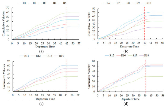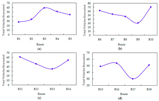 Total vehicles evacuated along different optimal routes from the four exits of the parking lot. (a) Exit E1. (b) Exit E2. (c) Exit E3. (d) Exit E4.