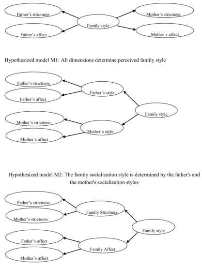 To analyze the combination of the different dimensions which together make up parenting styles (both paternal and maternal) and their effect on family socialization style, three different structural regression models were empirically compared. The first model (M1) postulated that the four dimensions (mother’s affect-communication, father’s affect-communication, mother’s strictness, and father’s strictness) have a direct influence on family socialization style, as perceived by the child. The second model (M2) postulated that paternal dimensions (affect-communication and strictness) combine to form the paternal style, and that the maternal dimensions combine to form the maternal style, the child’s perception of both styles would then result in their perception of the family socialization style. The third and final model (M3) postulated that both affect-communication dimensions (father’s and mother’s) influence a variable called "family affect-communication", and both strictness dimensions (father’s and mother’s) influence a variable called "family strictness," both variables would then combine to give the family socialization style, as perceived by the child (see Figure 1).
