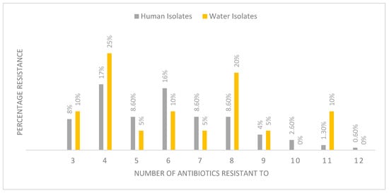 The overall prevalence of MAR revealed that 76% stool and 90% water Campylobacter isolates were simultaneously resistant to more than three of the antibiotics tested (Figure 1). MAR in this study was defined as the resistance of Campylobacter to two or more antibiotics []. Two isolates each from water and human stools were concurrently resistant to up to 11 antibiotics. The presence of MAR was observed more in C. jejuni isolates.