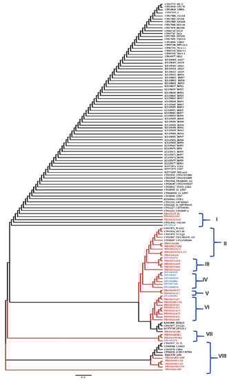 - Kumar, S.; Stecher, G.; Tamura, K. MEGA7: Molecular Evolutionary Genetics Analysis Version 7.0 for Bigger Datasets. Mol. Biol. Evol. 2016, 33, 1870–1874. [Google Scholar] [CrossRef] [PubMed]