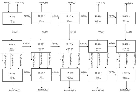 The demographic-sub model was then overlaid with the diabetes dynamic sub-model defined in the Supplementary Information S2 and Supplementary Table S1. In the diabetes dynamic sub-model, type 1 and type 2 diabetes were not distinguished although globally 90% of all cases were type 2. Population were further divided into the three health statuses: healthy (CH), undiagnosed diabetes (CDM_un), and diagnosed diabetes (CDM) (Figure 1).