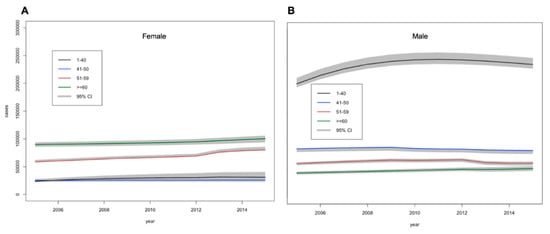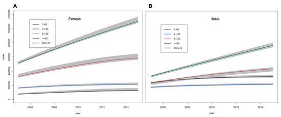 Estimations of the number (95% credible intervals) of (A) females and (B) males with diabetes between 2005 and 2015 by age.