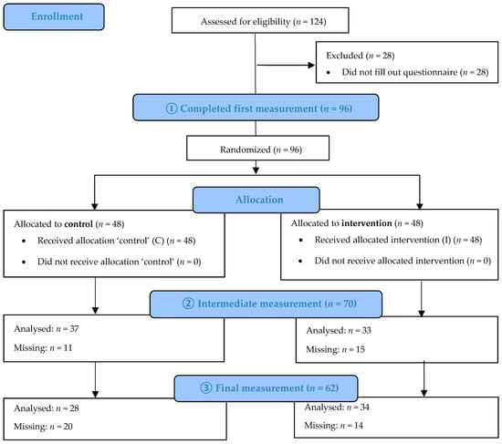 In order to analyze the differences between the intervention and control groups over the measurement period, analyses of covariance (ANCOVA) were used. Differences in baseline measurements were corrected for using the baseline values as covariates, with the grouping variable as the fixed factor. The assumptions of the ANCOVA analyses were tested to make sure no abnormalities in the data were observed [45]. For the analysis, an intention-to-treat analysis was used to study the results as measured.