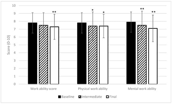 Trajectory of general, physical, and mental work ability during the peak season. Mean and SD are shown with error bars. A score of 0 stands for no work ability at all, and 10 corresponds to the best work ability ever experienced. Values with * or ** showed significant changes compared to baseline measurements: * p < 0.05, ** p < 0.01.