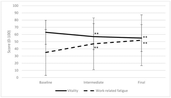 Trajectory of vitality and work-related fatigue during the peak season. Mean and SD are shown with error bars. A lower score indicates a lower vitality and less work-related fatigue. Values with ** showed significant changes compared to baseline measurements: ** p < 0.01.